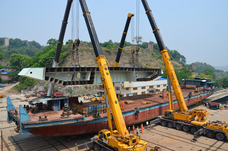 中午12时,伴随着噼噼啪啪的鞭炮声,首节梁段开始装船。装船是采用平板车由加工车间将梁段运至托船架轨道上方,同时托船架入水将运输驳船回拉上岸,采用四台200吨汽车吊配合将梁段提升至指定高度,再用卷扬机将驳船沿轨道托至梁段下方,平稳地放置到驳船上,最后用托船架将驳船与梁段整体放入水中。