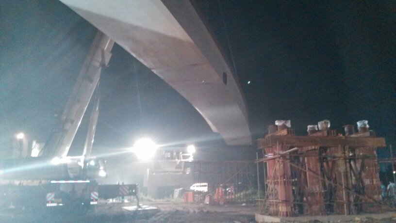 北京市京良路改建工程第三标段北辅路钢箱梁吊装由于跨越京港澳高速公路的一个匝道,只能在晚上12点到早6点要点封路吊装。经过分厂领导的科学组织及现场工作人员的提前准备,8月2日晚12点开始吊装,经过紧张施工,5日清晨顺利完成钢箱梁的吊装合龙。