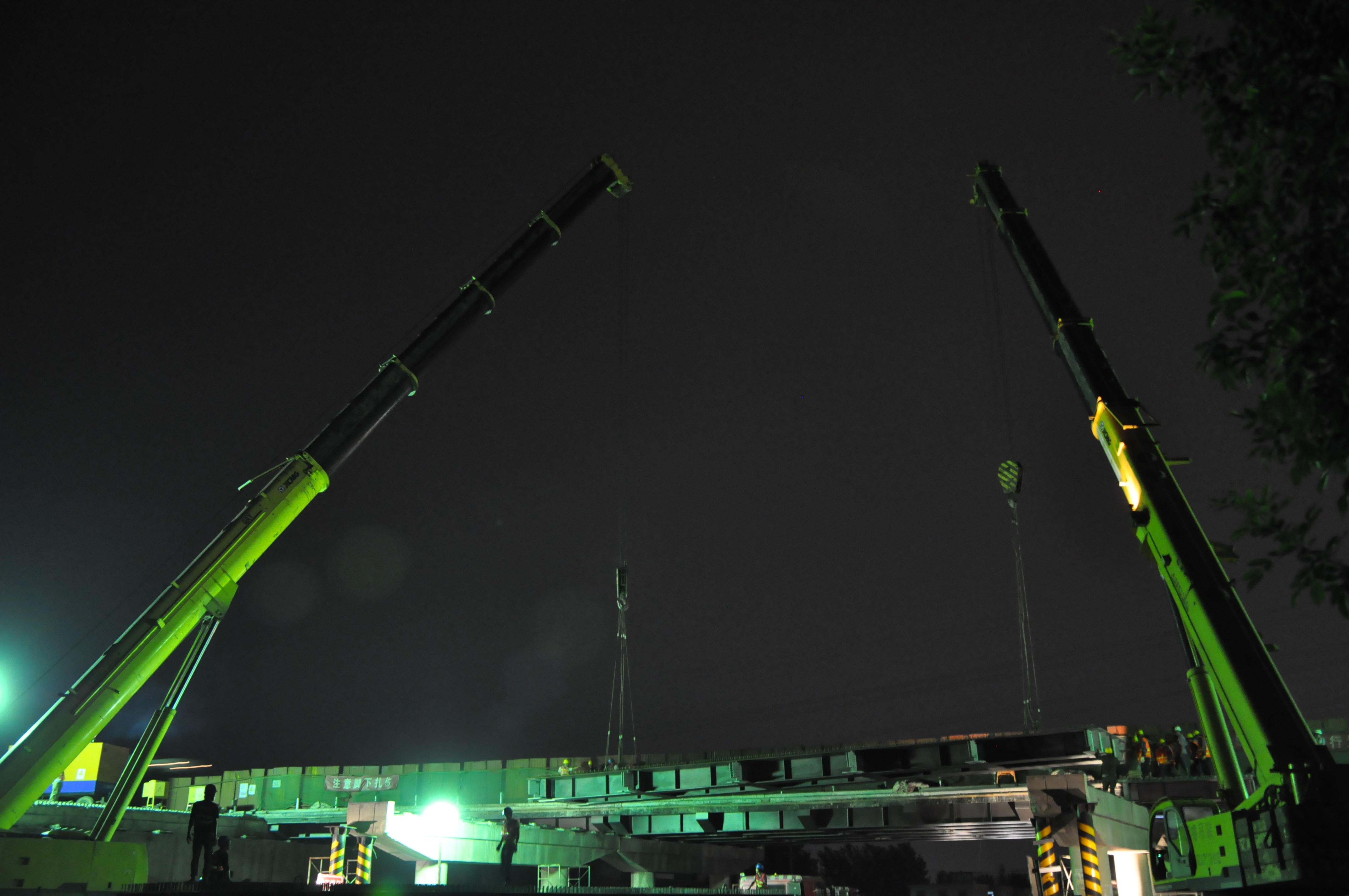 继8月4日太和桥北侧桥吊装完成后,高碑店分厂一鼓作气赶制加工南侧箱梁,并于8月26日运输至吊装现场,按计划27日晚21:30准时吊装,公司党委书记尹相宇、副总经理金煜涛等到吊装现场指挥。