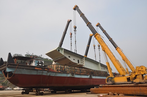 11月19日下午3时,永川桥钢箱梁合拢段在4台汽车吊的配合下顺利装船,至此,钢箱梁厂内制作全部圆满完成。
