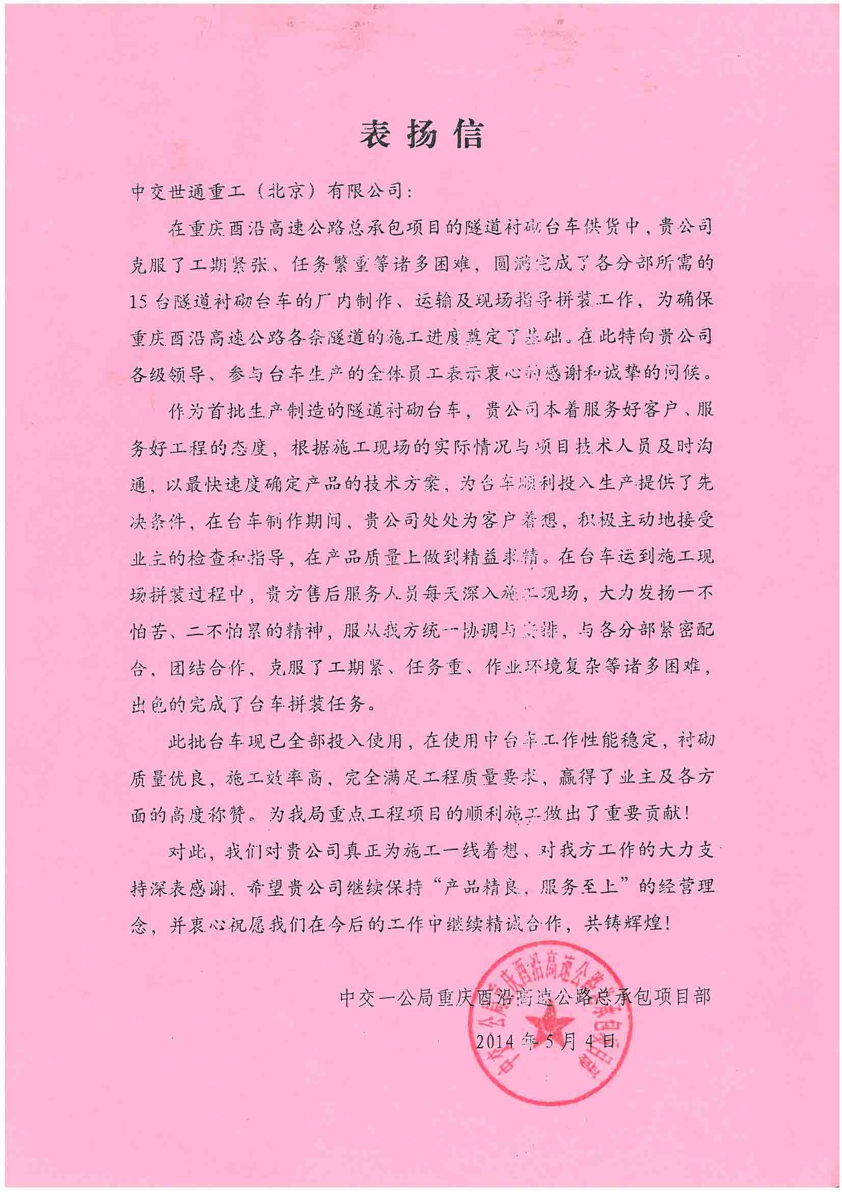 5月20日,公司收到重庆酉沿高速公路总承包项目部寄来的锦旗和表扬信,对公司在酉沿高速隧道衬砌台车供货及服务过程中所做出的工作给予了充分的肯定。