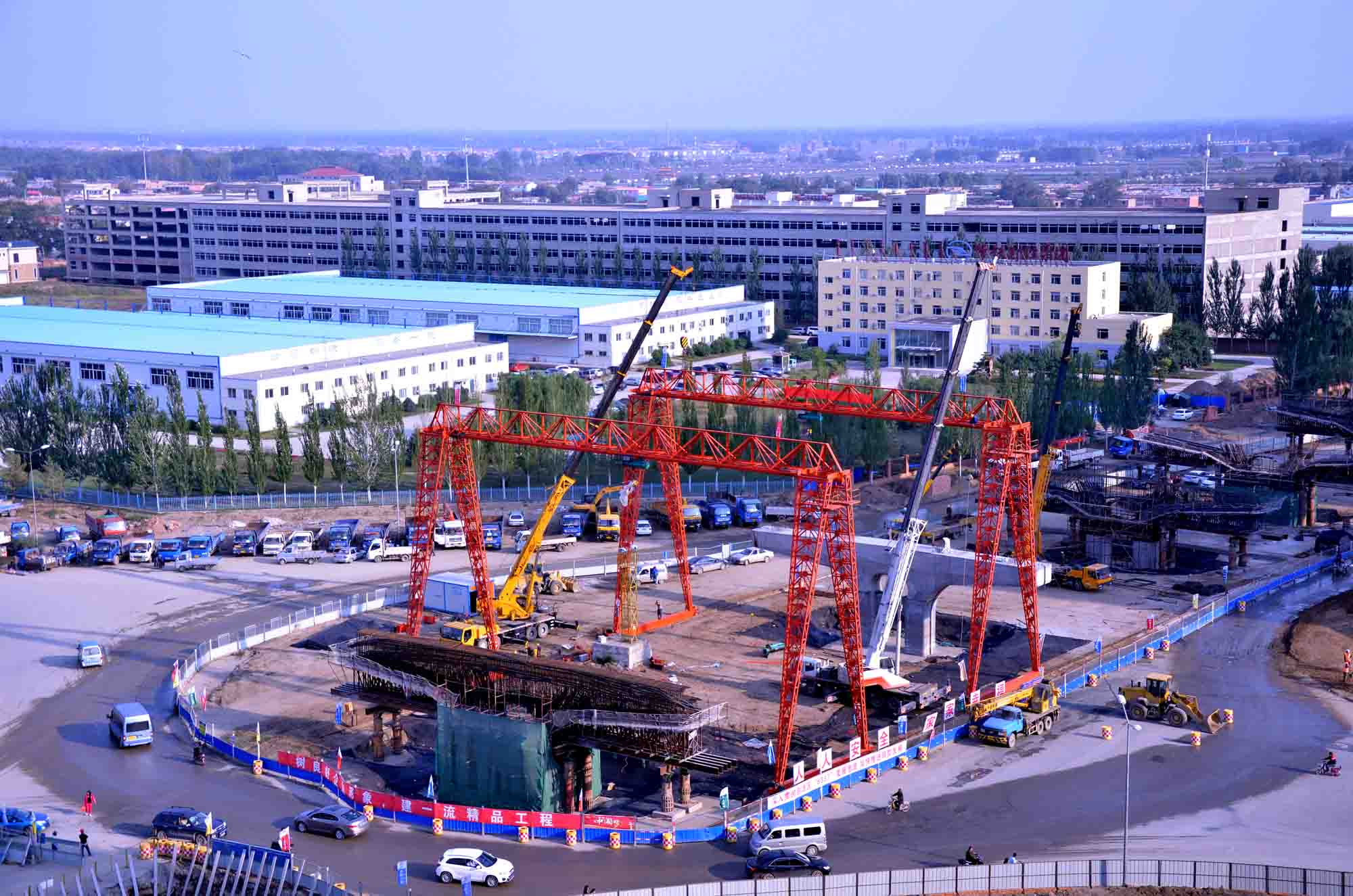 9月17日,通州分厂承接的呼市科尔沁快速路工程47+40米钢箱梁桥两台龙门吊组立完毕,标志着47+40米桥正式进入施工阶段。 该桥使用的龙门吊为电动葫芦门式起重机,跨度33米,额定起重量为10吨,最大起升高度为18米。该套设备于15日早晨6点入场,至17日下午5时调试完毕,目前已投入使用。 47+40米桥位于快速路工程中段,地处如意河大街与科尔沁南路交叉口,车流量较大。在阳光的照耀下,两组龙门吊拔地而起,宛如冲天的利刃,颇为壮观,引得往来行人驻足观望。橘红色的塔身代表着项目组火热的干劲,为初寒的草原青城增添一抹暖色。