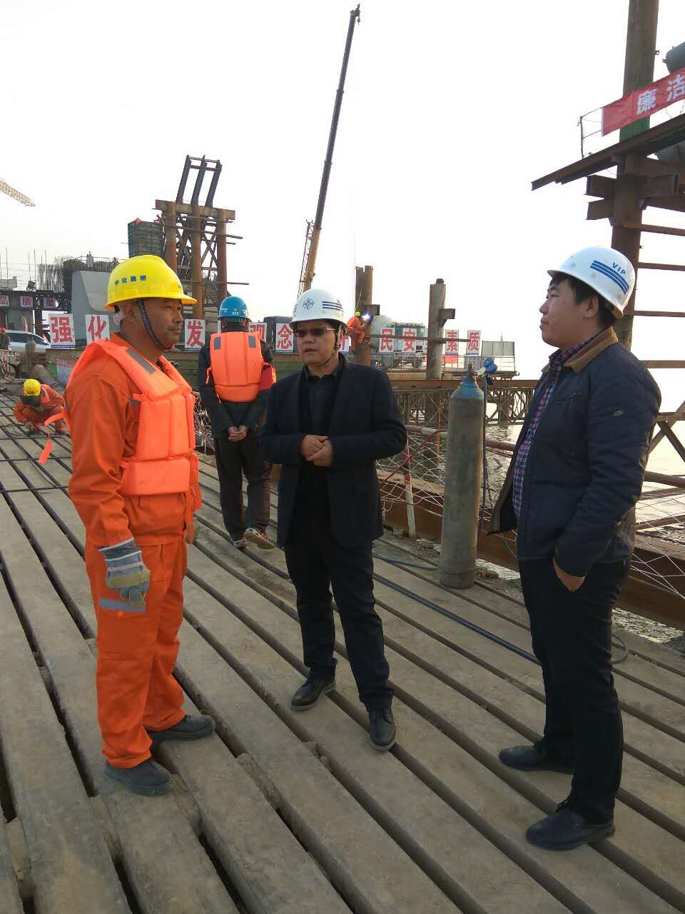 12月6日,公司副总经理赵启权在朝阳分公司副经理王加元的陪同下,莅临大冶湖项目武汉武船加工基地和大冶湖施工现场检查指导工作。 赵总首先来到武船加工基地对钢拱肋及钢主梁的加工情况进行检查,并详细了解安全生产、施工质量和施工进度等具体情况。随后赶往大冶湖桥位施工现场,对拱肋吊装准备情况及现场安全防护搭设进行详细检查指导。 检查过程中,赵总对项目前期工作表示肯定,强调要重点抓好安全、质量、工期三方面的工作,并表示大冶湖桥位现场施工环境恶劣、安装难度大,必须加强现场安全管理,严格按照施工方案做好安全防护措施,确保在万无一失的施工条件下严格把控工期节点,圆满完成通车要求。