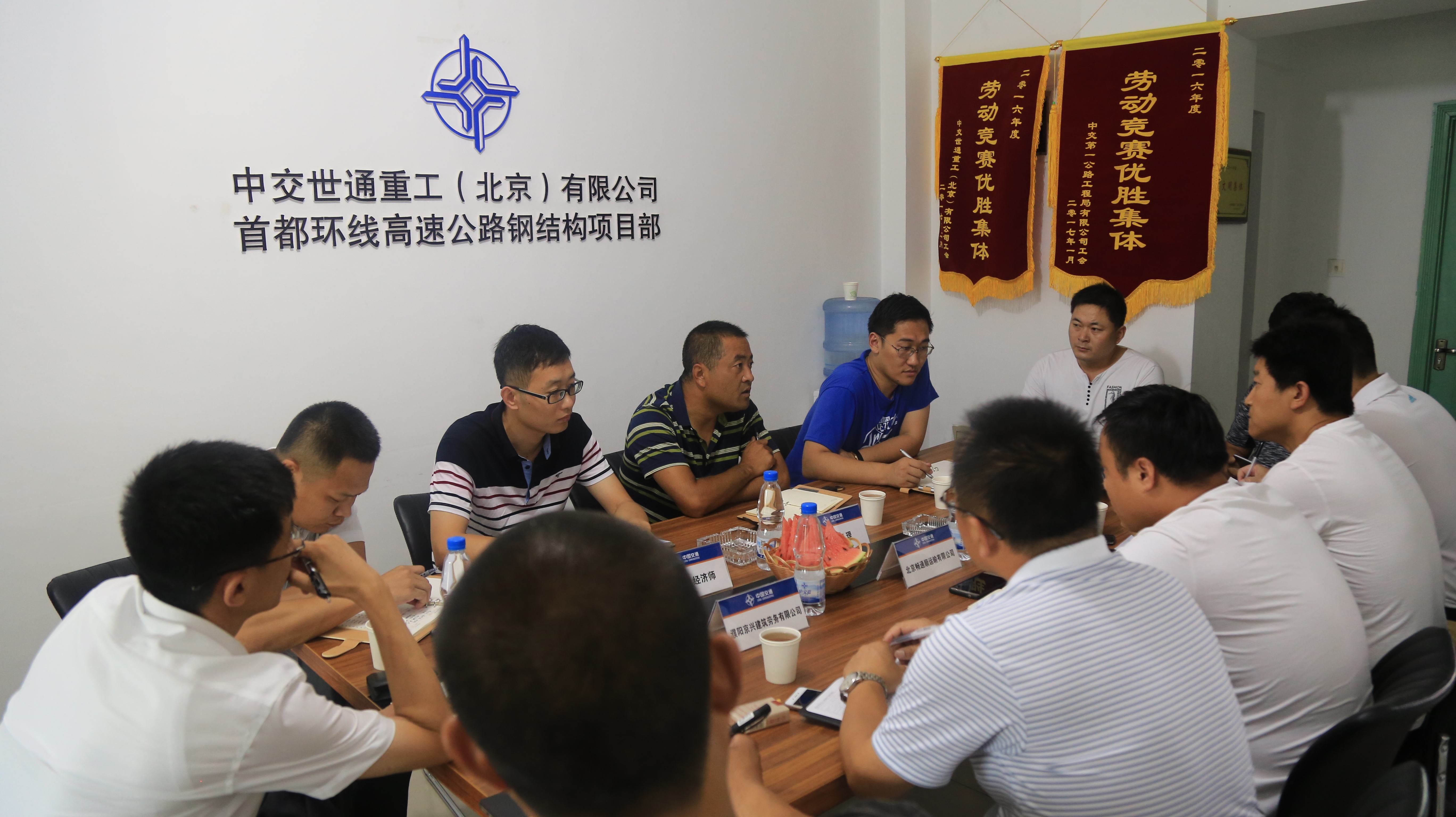 7月15日,首都环线工程通州-大兴段钢结构项目部在会议室组织召开现场施工开工动员大会,会议由项目经理李东生主持,项目总工程师徐贺、总经济师闫鹏等项目人员以及工程运输、吊装和现场安装在内的五家协作单位负责人参加本次会议。