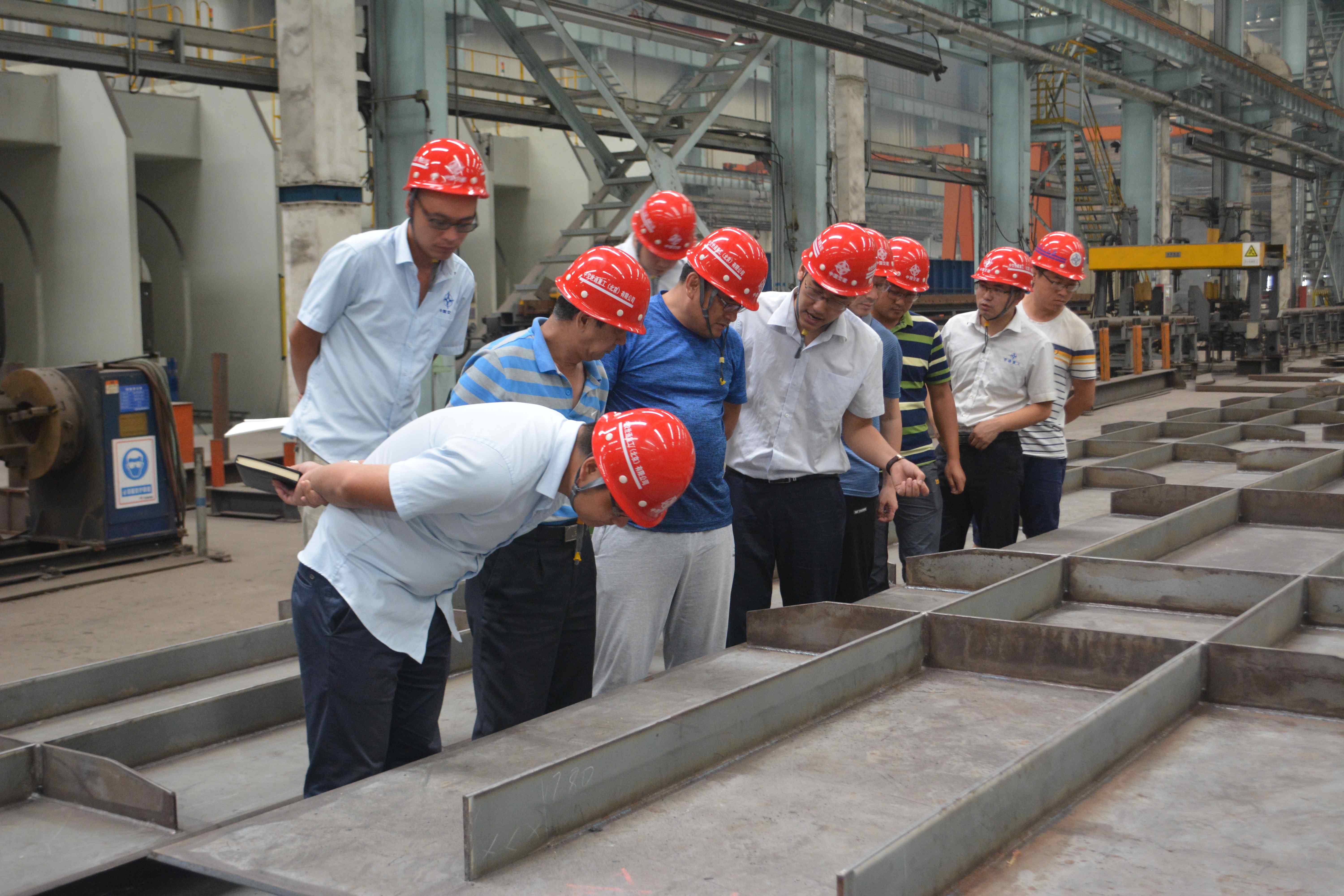 在会议室,项目技术质量施工部负责人首先以PPT的形式讲解了厂区的布置和目前的生产进度。在了解了相关情况后,项目总工程师徐贺陪同一行人来到厂区,逐一查看板单元车间、涂装场地、总拼场地、存梁场地,并重点对总拼场焊接质量控制、龙门吊作业安全及U肋组装质量进行了技术指导。最后,一行人对厂区的标准化建设、车间布置和施工质量等给予充分肯定。