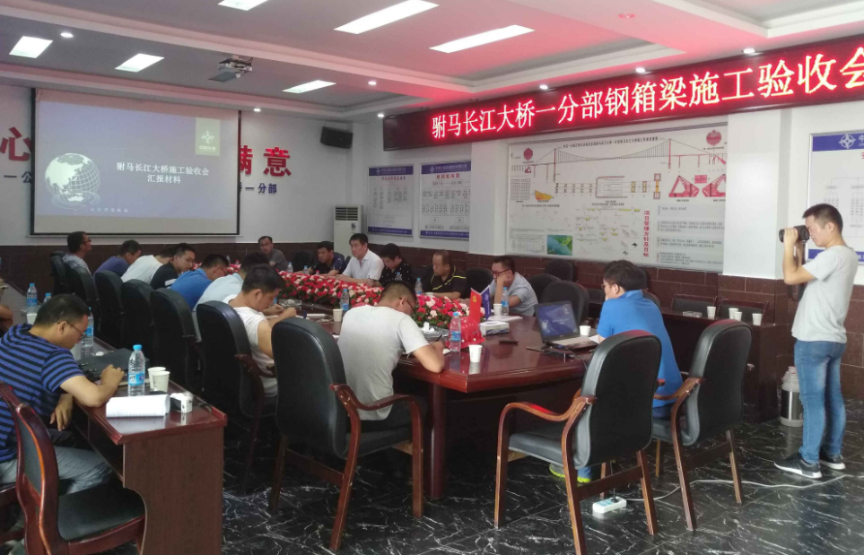 现场排查结束后,总部、总监办领导在会议室就钢箱梁现场验收情况进行总结指导。在验收会上,徐贺对现场施工情况进行汇报,并针对驸马桥重点、难点过程的控制进行总结。随后,第三方检测人员对现场检测情况进行汇报,并对现场焊缝质量和涂装质量作出高度评价。最后,总监理工程师刘日圣对钢箱梁总体施工做出总结,对钢箱梁环焊质量给予表扬,总体施工情况予以高度肯定。