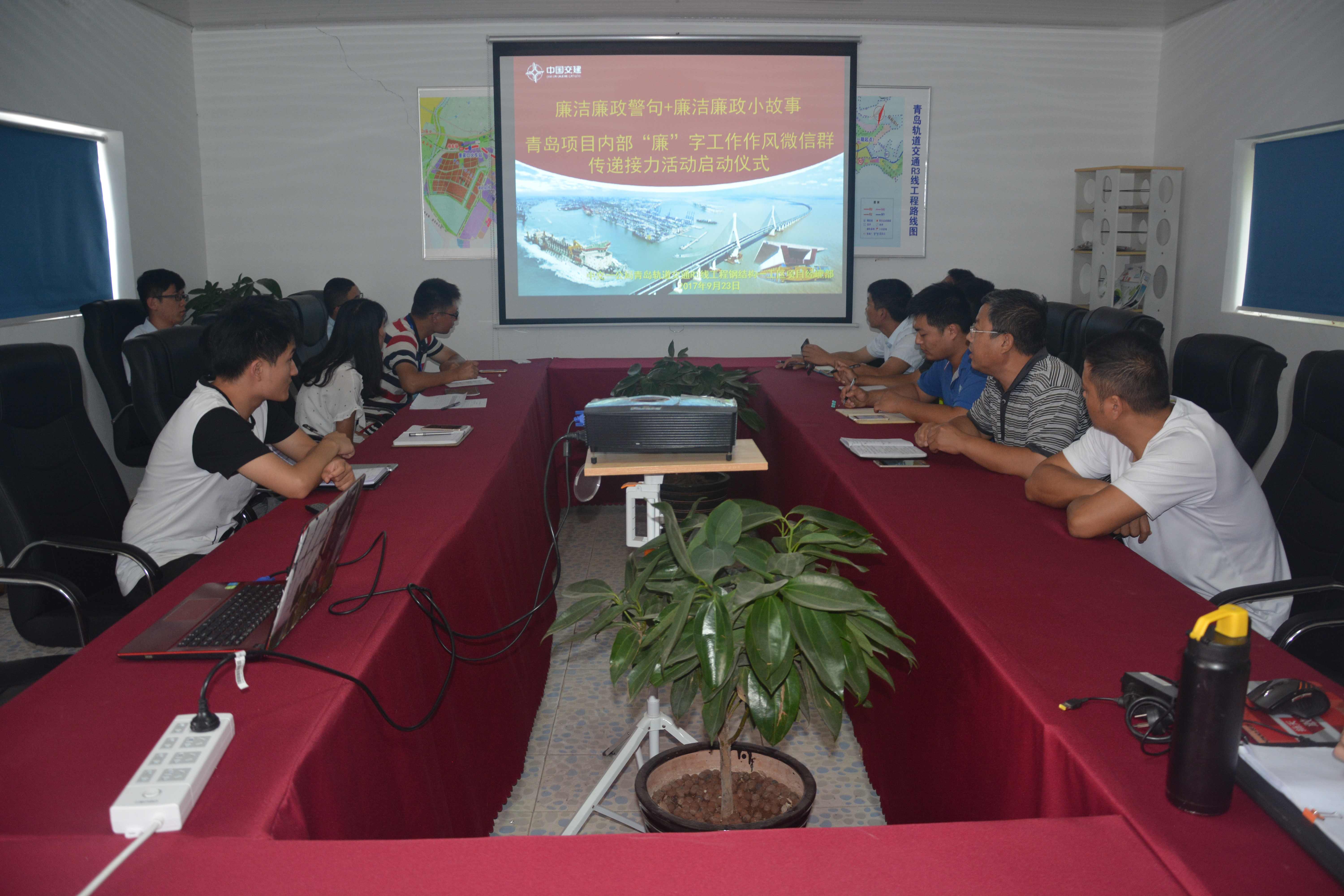 为贯彻落实中交一公局 “111”文化主题活动,加强企业文化建设,增强企业凝聚力和竞争力,9月23日,青岛项目组织全体职工在项目部会议室举办了“廉洁廉政警句和讲廉洁廉政小故事”及“‘廉’字工作作风”微信群传递接力活动启动仪式。