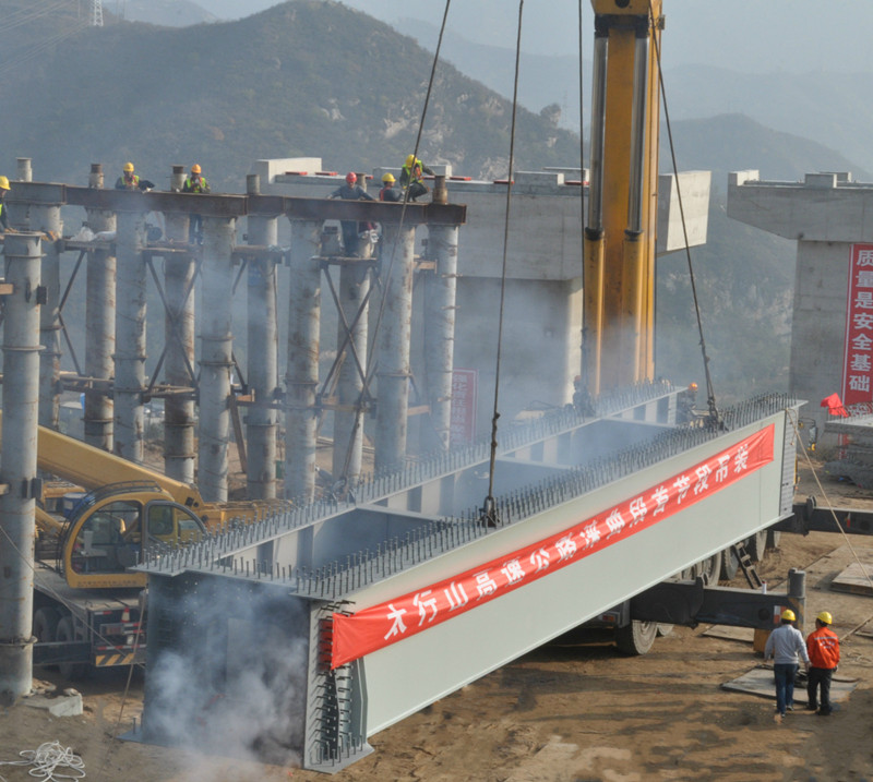 10月26日下午3点,伴随着汽车吊的轰鸣声,太行山高速公路涞曲段钢混梁项目吊装作业正式启动,起重吊装、司索信号、试吊检测、运梁、安装定位、高强螺栓安装等多个组各司其职、分工明确,整个吊装过程井然有序。