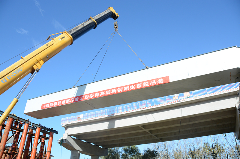 随着现场施工人员精准调整、定位、吊装,首都环线采育高架桥项目首段钢箱梁稳稳架设在墩柱上。至此,圆满完成首段钢箱梁的吊装任务,拉开了23联吊装序幕。