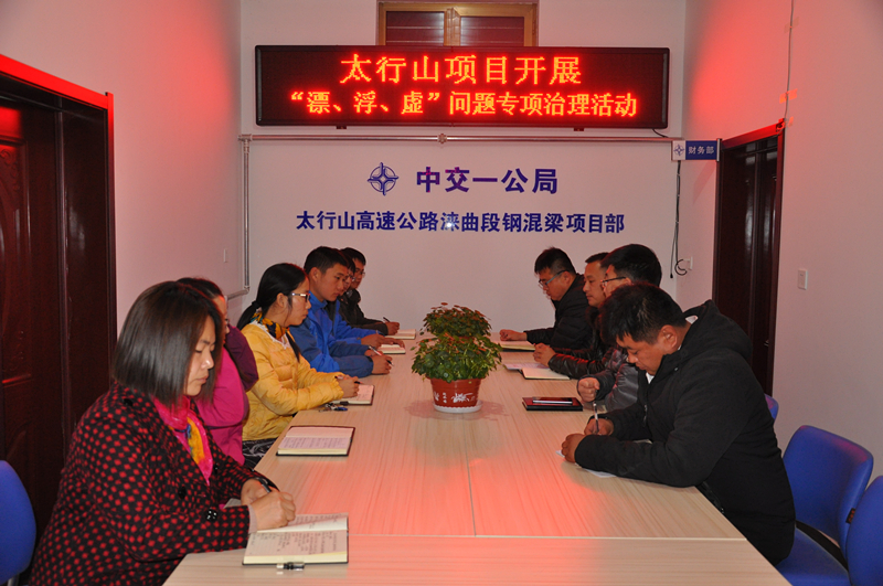 为深入改进工作作风,强化责任担当,进一步增强全体干部员工的责任感、紧迫感,根据中交一公局及公司的部署安排,11月16日,太行山项目开展“漂、浮、虚”问题专项治理活动。