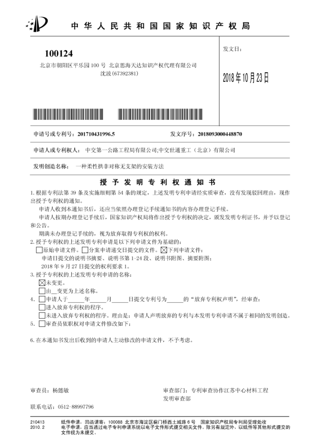 近日,公司申报的“一种柔性拱非对称无支架的安装方法”获国家知识产权局发明专利授权。本发明涉及一种钢桁梁柔性拱桥柔性拱的安装方法,属于连续钢桁梁柔性拱桥安装施工技术领域。