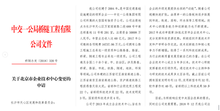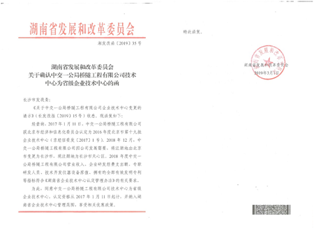3月18日,公司收到湖南省发展和改革委员会下发的《湖南省发展和改革委员会关于确认中交一公局桥隧工程有限公司技术中心为省级企业技术中心的函》[省发改函(2019)35号],同意公司技术中心为省级企业技术中心,并纳入湖南省企业技术中心管理范围,享受相关优惠政策。