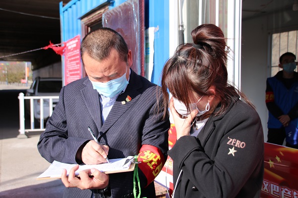 “我们是党员,我们不上谁上!”金海项目党支部党员陈建率先请缨,第一时间与巴彦镇政府取得联系,带领支部“党员志愿服务队”奔向了“黑土凹村”最大的防控点,4名志愿服务队员每人不间断轮值4个小时,按照巴彦镇政府要求测体温、登记人员信息、悬挂宣传条幅。