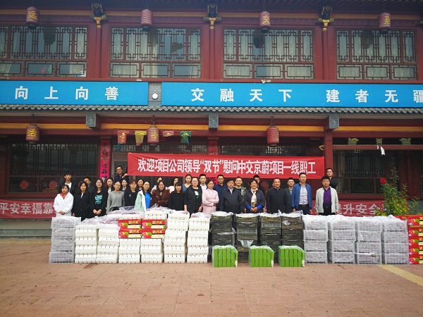金秋十月,丹桂飘香,在中秋、国庆双节同庆之际,中交建冀交高速公路投资发展有限公司副总经理申生光及京蔚项目管理处负责人朱丽杰来到京蔚项目,为坚守在生产经营一线的项目职工带来节日的祝福和问候,并带来了水果等节日慰问品。