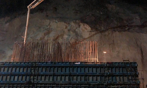 主墩位置先后经历了挡墙支护、开挖回填、爆破、山体防护、桩基施工、封底混凝土施工等重要节点工程。该承台设计尺寸14.6m*9.1m*3.5m,混凝土方量465方,属于大体积混凝土,墩身预埋钢筋精确度要求高,施工难度大。为确保大体积混凝土质量,项目部对施工方案进行设计、优化及比选,并及时进行施工前技术方案的交底,同时项目部试验室提前优化配合比,降低混凝土水化热,施工时按照方案要求加设冷却管,进行水循环降温。在降温过程中,项目部采用电子测温仪测量混凝土中各个部位温度,切实保证了大体积承台的混凝土浇筑质量。