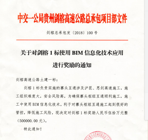 近日,剑榕一标项目在关于使用BIM信息化技术应用方面获得业主奖励50万元。